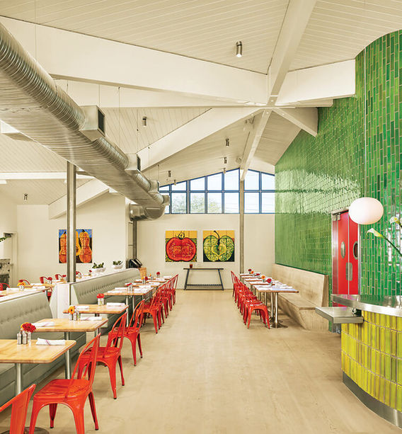 Just off of South Congress, in a low-slung mid-century building from the fifties that was once known as the Pig Stop, Vinaigrette ATX nestles in the shade of one of the oldest Live Oaks in town. With intersecting gables, a beautiful bright green tile wall that echoes the lush outdoors, sustainably harvested wood flooring and custom galvanized window walls, the space is bright and uplifting both in and out. One of our customers called it “a happy greenhouse for humans.”